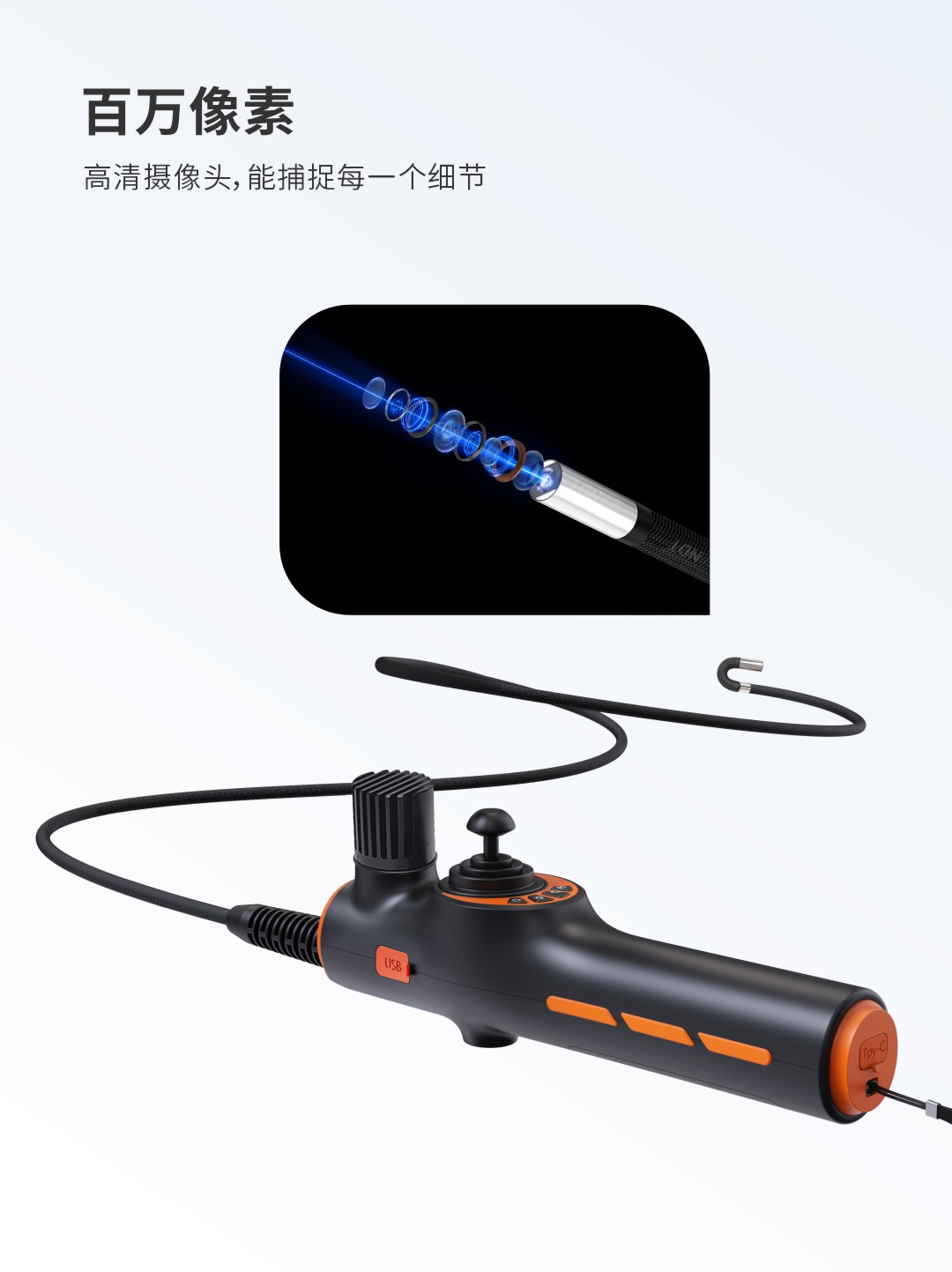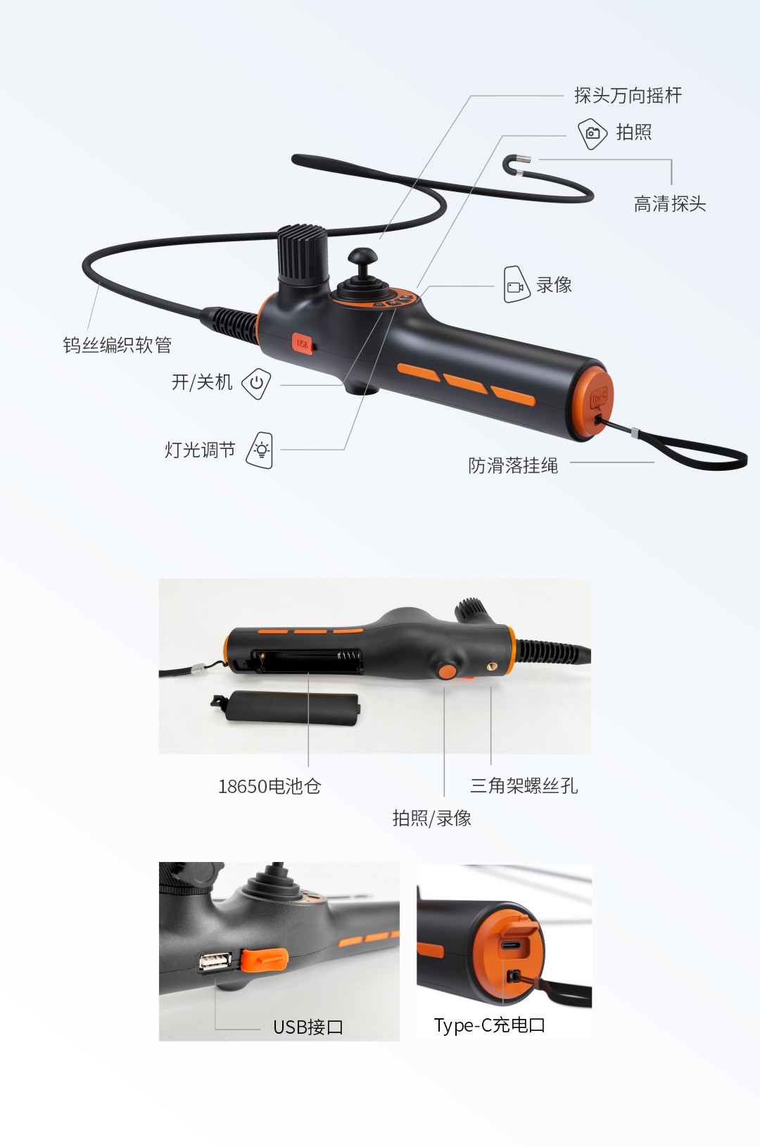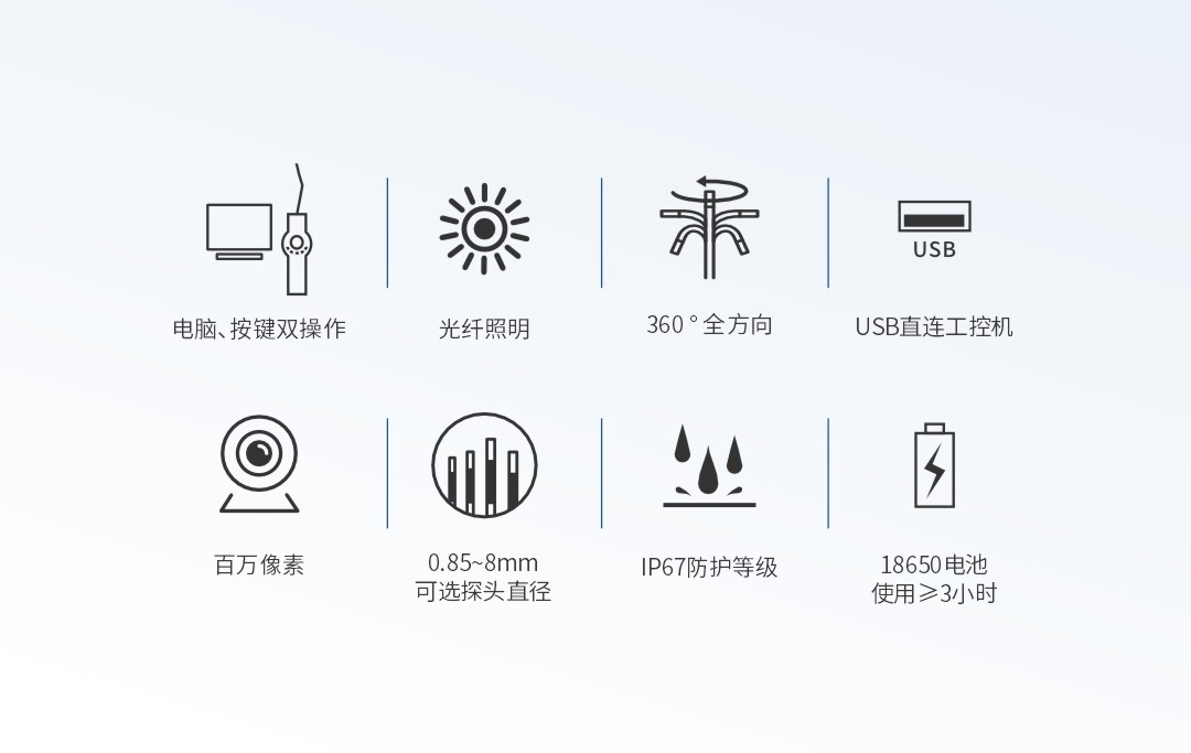 優(yōu)勢特點:USB接口直連電腦(工控機),0.95-8mm管徑可選、360°全方位擺頭、18650電池、配備Type-C充電口充電