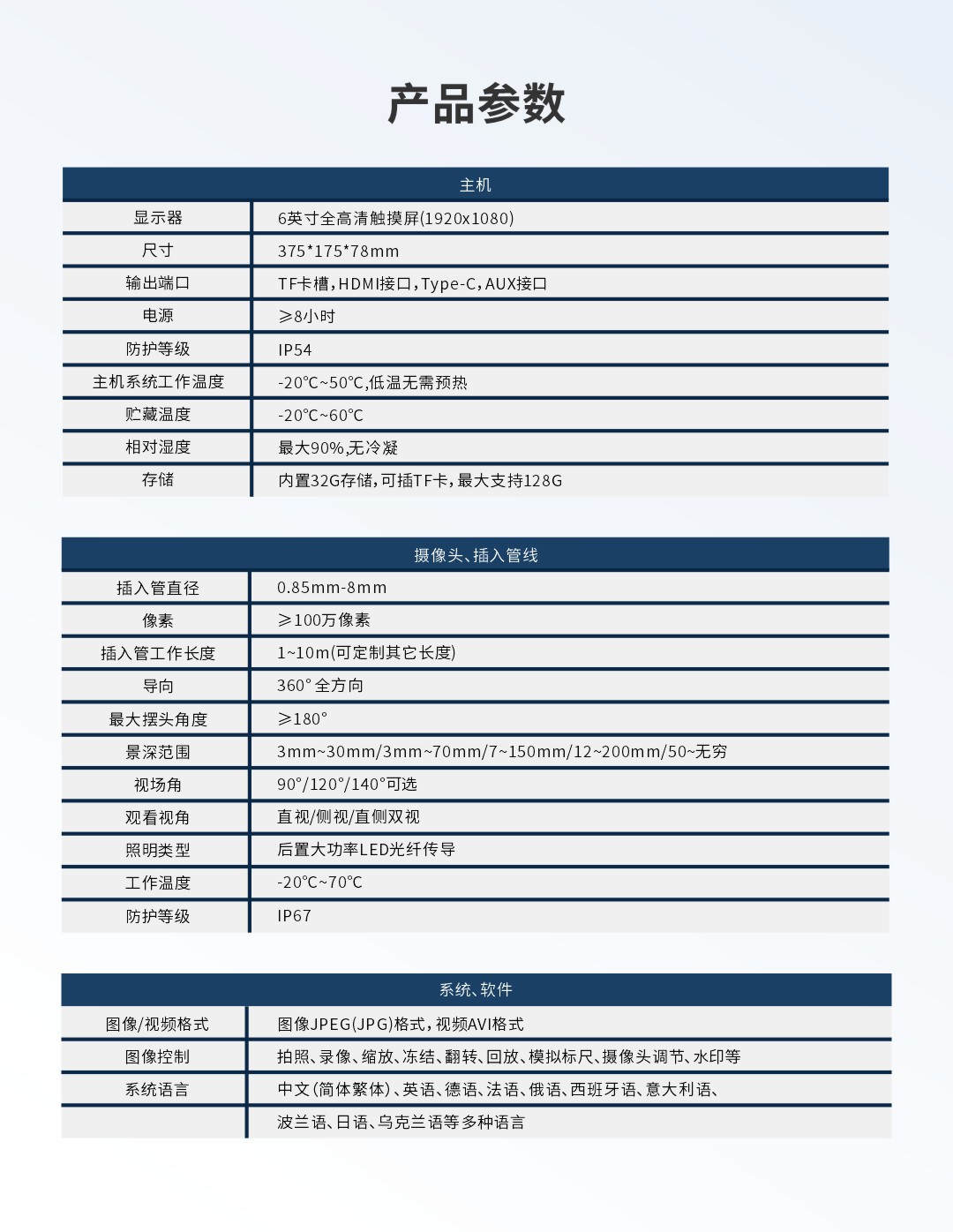 優(yōu)勢特點:6英寸高清觸摸屏、快速更換管線、360°全方向擺頭、后置LED光纖導(dǎo)光、18650電池,工作時長≥8